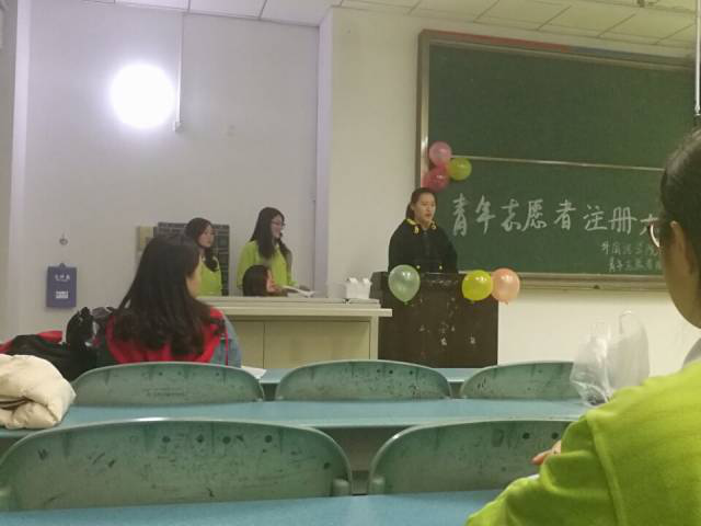 之后,由外国语学院分团委副书记陈羽发表讲话,在讲话中,她用自己的亲身经历强调了大学生参加青年志愿者活动的重要性和必要性。以及大学生在大学期间应如何把握好时间,充实自己,成就自己,让自己的大学生涯过的有价值,有意义。讲话中的一字一句都是作为一位学姐在激励大一的各位学弟学妹。同时她的讲话也赢得全场掌声连连。