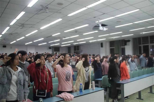 会议伊始,迎团旗,奏唱《青年志愿者之歌》。其次,魏玮老师围绕本次活动的主题青年志愿者进行了发言致辞。随后,2016级优秀志愿者代表贺佳星和大家分享他暑期支教的经历和感受,让同学们对青年志愿者工作有了进一步的了解。其后,分团委副书记陈柳曳上台带领大家进行了庄严宣誓,并由2018级新生代表田雨壹同学上台讲话,发表了她对青年志愿者的理解。 在大会的最后,2018级全体同学在横幅上庄重的签下了自己的名字。