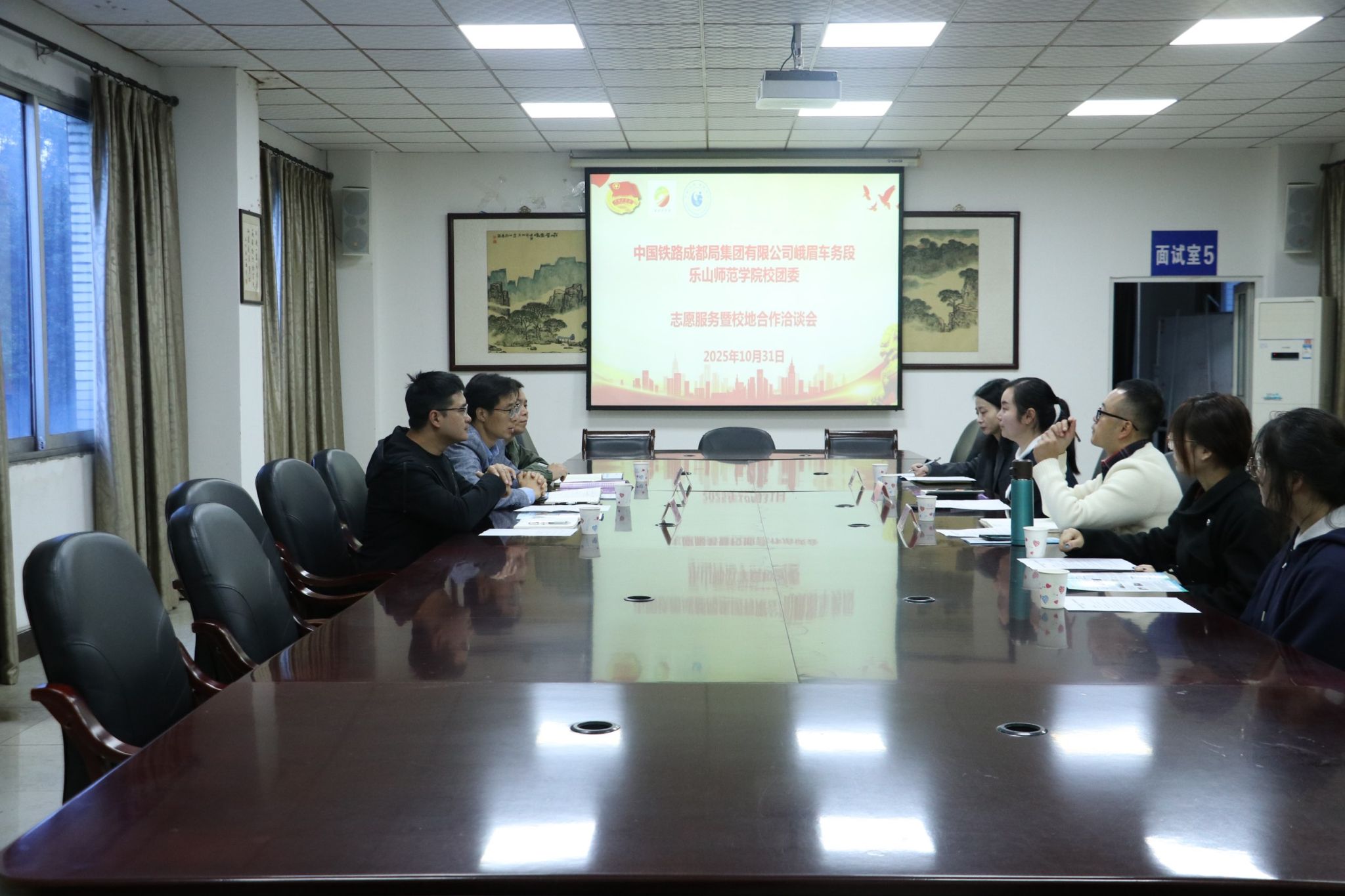 “当前我们两家的高铁志愿服务开展非常顺利,也很感谢乐山师院师生长期以来对我们峨眉车务段志愿服务工作的大力支持。下一阶段,我们想借助贵校在专业设置和人才培养上的优势,深化现有的志愿服务机制,并拓展校地合作领域。”洽谈会伊始,王昌这样阐述到。“感谢成都局集团峨眉车务段对我校师生开展志愿服务工作的大力支持,校团委要增加志愿服务工作类型,协调整合校内师生资源。我们也要把美育融入双方合作,扩大合作力度。“翟雅媛表示到。余雨懁就校团委当前志愿服务现状和校地合作类别进行了进一步阐释,王一鸣就双方合作状况和当前存在的一些问题进行了补充发言。